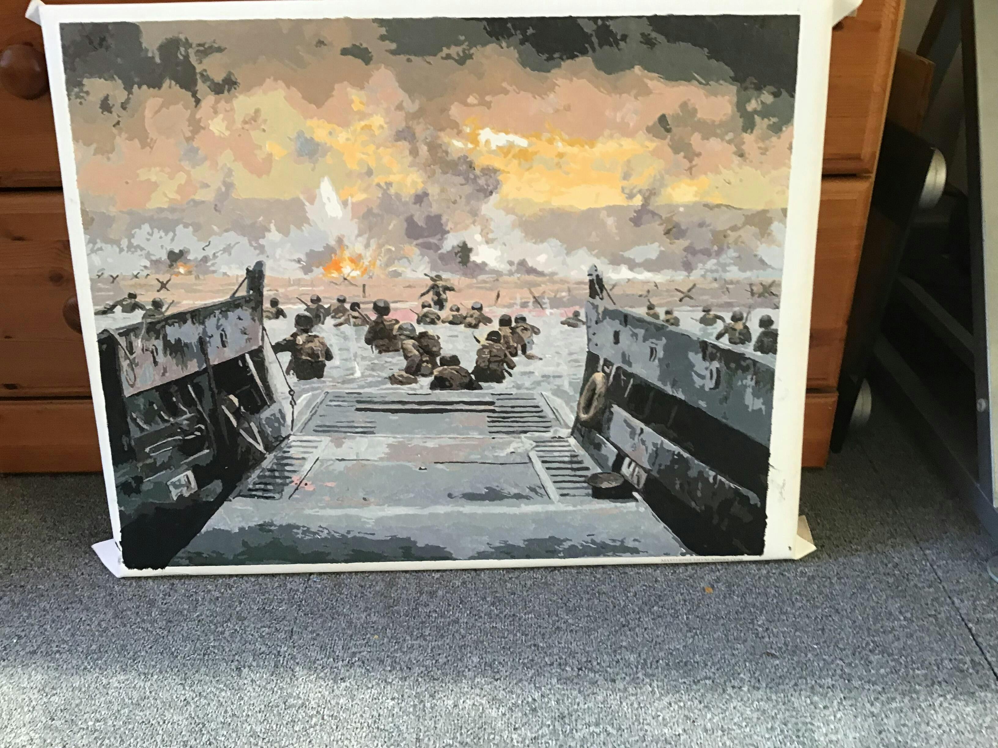One of the more dynamic paintings in the catalog (see also “Battle on the High Seas”). I presume this is Utah beach. I have some issues with this painting but it would be churlish of me to point them out. Take your time and give this painting the attention it deserves. You’ll get a finished product that will grace any wall. (Let’s remember that British and Canadian troops were also involved).