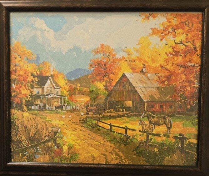 This painting jumps out of the canvas with such intensity of colors and captures the feeling of autumn on a farm. it is a lot of detail and required a great deal of patience to complete, but the final product is worth the work