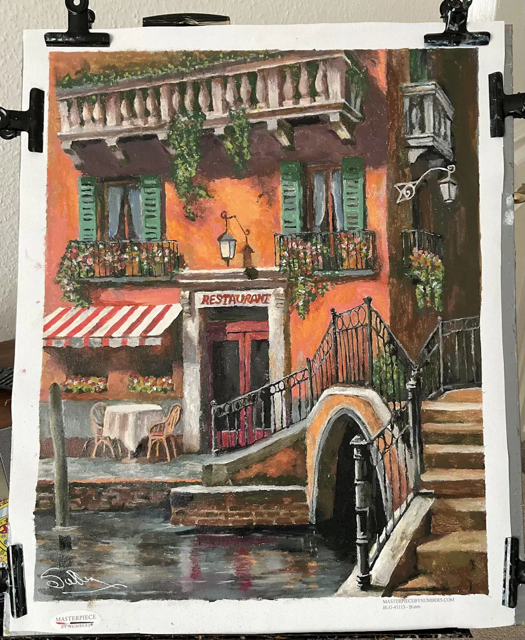 BISTRO is calling all food painters! I have a Bistro sign in my eat in kitchen area so this quality old world painting was a must do for me. It is very detailed which I like, and takes patience and a tiny brush in many most cells. Had plenty of paint. Keep your paints moist with water droplets and there is no fear of running out. The picture is darker than cell phone picture shows but still so nice when framed out, it all pops!