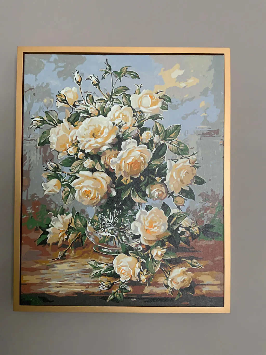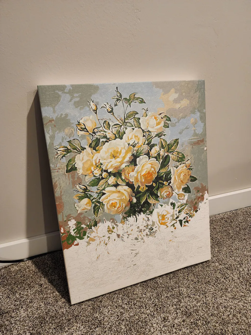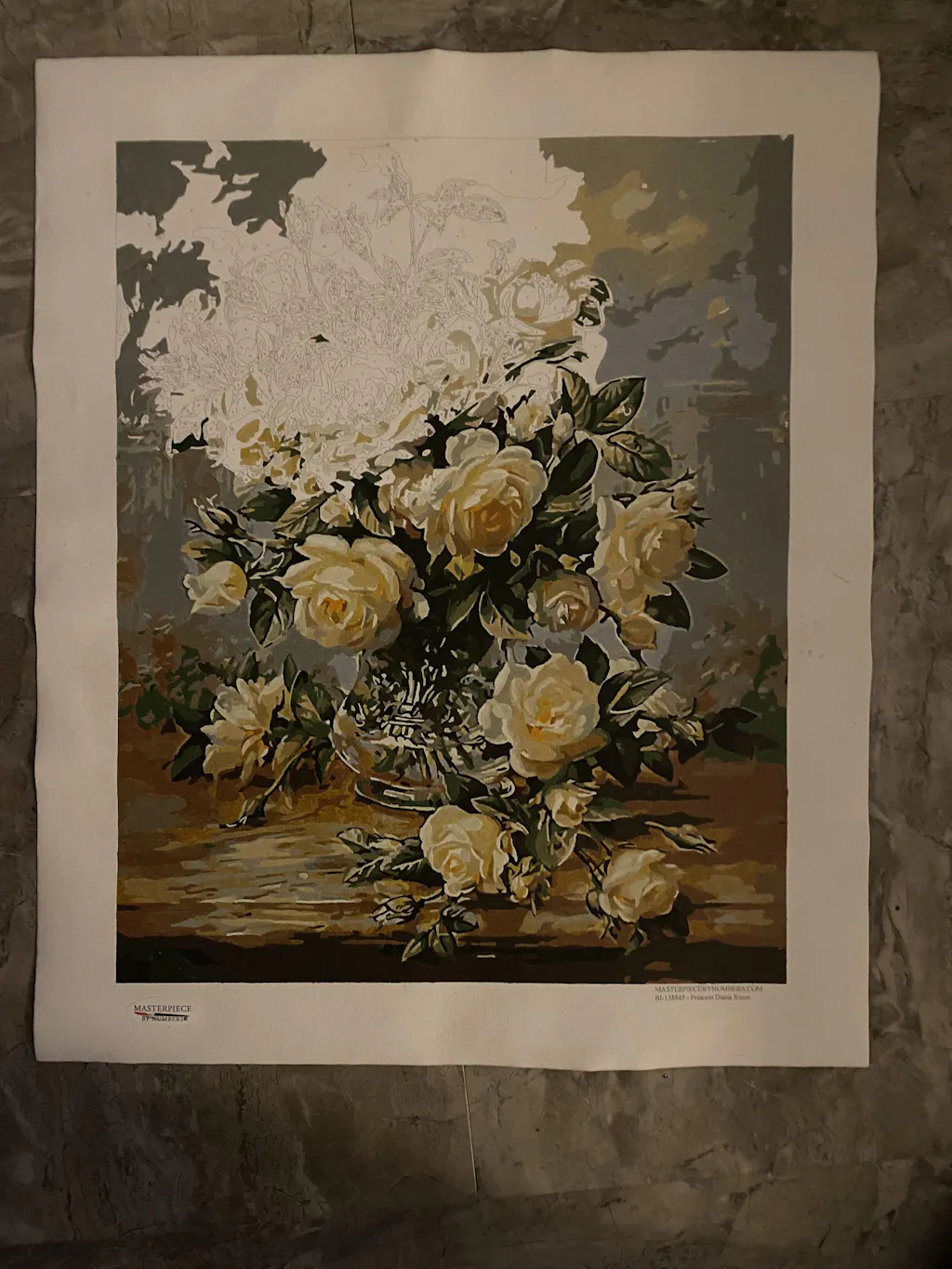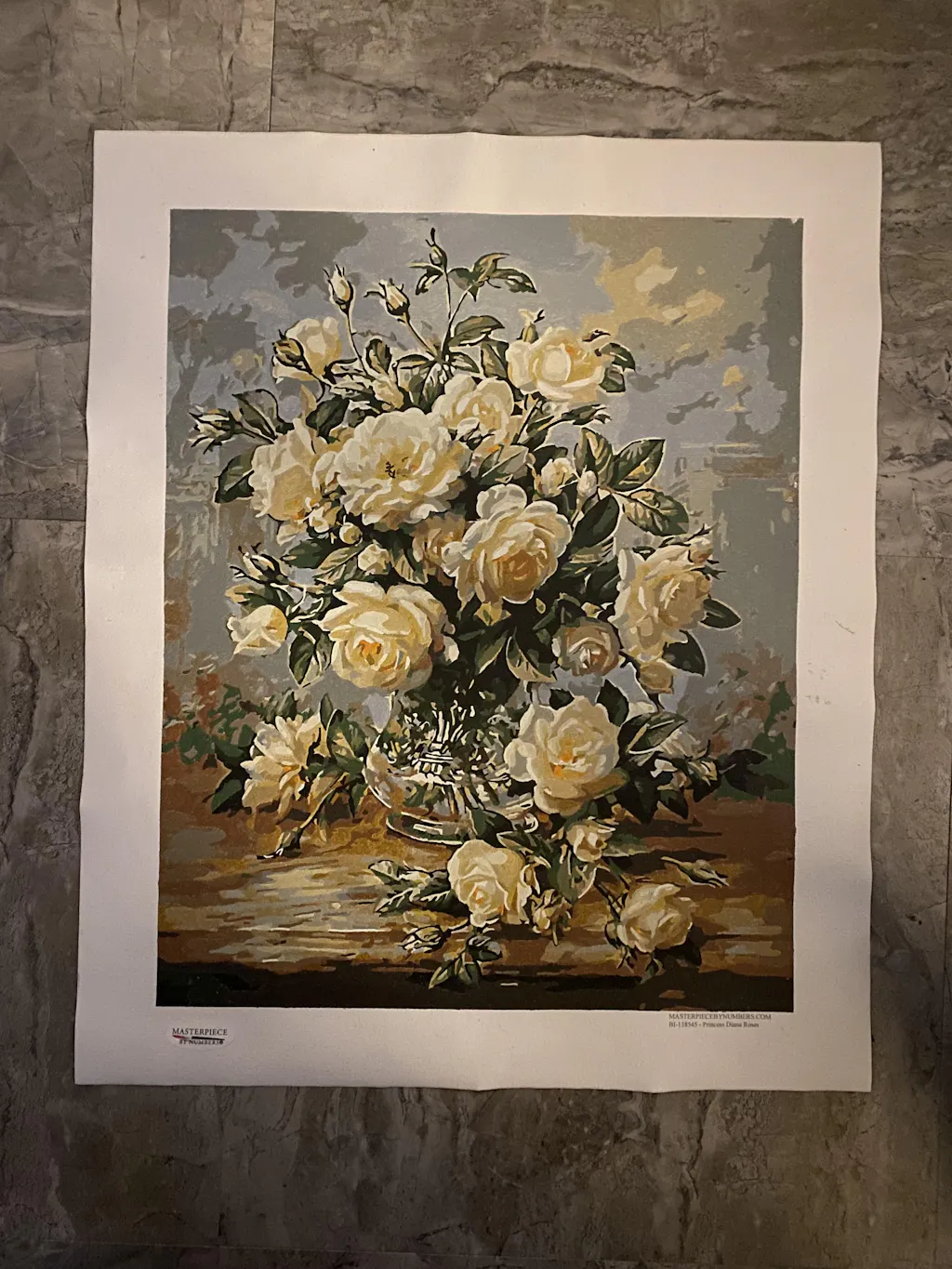 This is my second painting from Masterpiece By Numbers. While the canvas and paints are high quality and I’ve been enjoying doing these paintings (they are quite challenging!) the colors for both are very different from the pictured artwork. Instead of white roses, these are different shades of yellow, tan, beige and brown… I would like this more if the roses were white instead of yellow/beige/brown. The photos in the reviews give a better idea of what the actual colors are like.