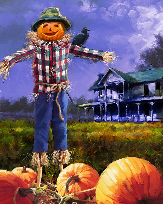 Scarecrow by Richard MacNeil - This Scarecrow painting features a raven, pumpkins, and a haunted house in the background. Perfect for adding a spooky touch to your Halloween decor.