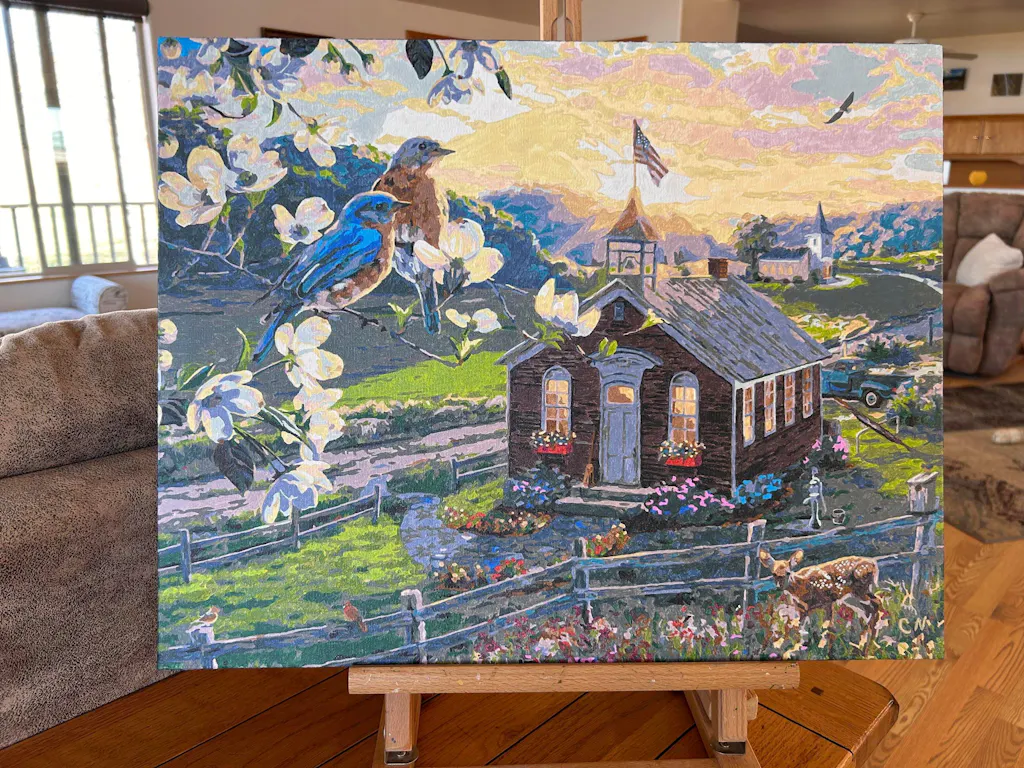 School Days by Darrell Bush - Set amidst a rolling countryside bathed in soft morning light, School Days captures the charm of a bygone era. A quaint wooden schoolhouse stands at the heart of the scene, its iconic American Flag and bell tower evoking memories of laughter, learning, and simpler times.